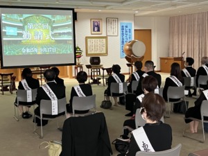 脇祖さま報恩会の式典。女子部による奉献、体験説法・甲斐北支部の山本記代主任(会員用ページからご覧ください)