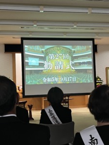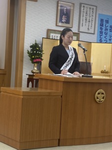 脇祖さま報恩会の式典。女子部による奉献、体験説法・甲斐北支部の山本記代主任(会員用ページからご覧ください)