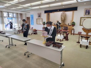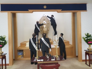 今年は、佐保教会長さんも入っていただき、お身拭いをさせて頂きました。1年間の感謝を込めて、少人数ではありましたが、ご本尊さまを中心にお身拭いさせて頂きました。レースのカーテンも交換させていただき、そのお姿は一層光り輝くお姿に生まれ変わりました。(と、皆さん見えました。との感想?!)