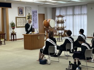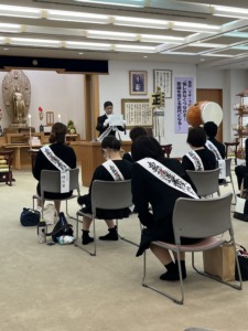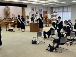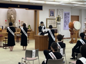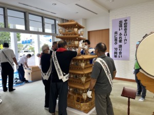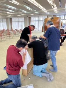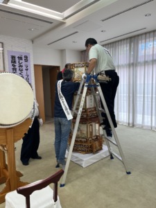 生誕地まつりで万灯行進に使用する万灯2基を、壮年部支部部長と有志の皆さんで法座席に設置させていただきました。設置後、参加者の皆さんで陀羅尼の祈願供養をさせていただきました。