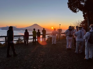 お願いだけで終わるのは申し訳ないとのことから、「お礼参拝」をさせていただきました。青年を含め、昨年同様16名の参拝。26日朝、全員で波木井山に祈願参拝。天候が危ぶまれましたが、ご来光の時だけ雲が晴れ、素晴らしいご来光を拝むことができ、70周年の締めくくりとして、お礼をさせていただくことができました。帰りには、波木井山でお礼言上をさせていただき、用意していたお弁当を皆さんでいただくことができました。甲府教会では、教会長さん始め多くの支部長さん方に、お出迎えをいただき、一同感謝でいっぱいでした。