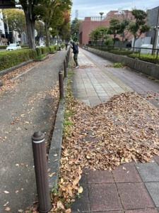 今年も平和通り歩道と教会内境内の落ち葉清掃の季節がきました。地球温暖化の影響で、紅葉も遅れがちでしたが11月中旬から、例年通りの落ち葉が広がっています。道場健幸行の当番さんだけでは、処理しきれない落ち葉を、壮年がまとめてボランティア袋に回収。毎週日曜日に3支部づつの当番で清掃奉仕をさせていただいています。当番以外の青年・壮年のご参加も大歓迎です。