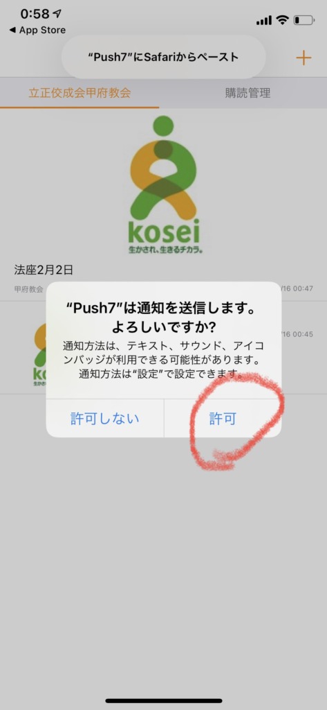 iPhoneでの通知設定 2021 2/16 Uncategorized 2021.02.16 2021.02.16 ①購読するボタンをクリック ②購読用アプリをダウンロードをクリック ③Appleストアからアプリをダウンロード ④アプリを開き、次へボタンを押す ⑤通知の許可で次へをクリック ⑥通知を受け取るで、完了をクリック ⑦”Push7″は通知を送信します。よろしいですか? 許可をクリック ⑧お疲れ様でした。これでホームページが更新された際に通知が来ます。 もしも、通知設定を拒否にしてしまった場合は、以下のボタンから再度設定可能です。 The following two tabs change content below.この記事を書いた人最新の記事 長田 甲府第二支部の長田です。サイト管理・運営を担当しています。たまに記事書きます。最近はおうち時間を良い事に暴飲暴食ばかりしています。 最新記事 by 長田 (全て見る) 初めて見る方はお読み下さい - 2021年2月15日 令和3年2月涅槃会 - 2021年2月15日 節分会盤上解説 - 2021年2月14日 Uncategorized よかったらシェアしてね! URL Copied! URL Copied! 初めて見る方はお読み下さい Androidでの通知設定